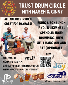 Join our community of rhythm-loving people at Inside Circle’s Trust Drum Circle! We’re making our own beats with Maseh Nchang & Ginny, expert drummers with a passion for building community connections and fostering acceptance for all, as they share their gifts of rhythm and connection with Inside Circle. All abilities welcome! Bring your own instrument or use one of ours.