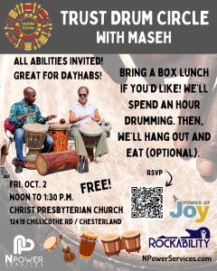 Join our community of rhythm-loving people at Inside Circle’s Trust Drum Circle! We’re making our own beats with Maseh Nchang, an expert drummer with a passion for building community connections and fostering acceptance for all, as he shares his gifts of rhythm and connection with Inside Circle. All abilities welcome! Bring your own instrument or use one of ours.