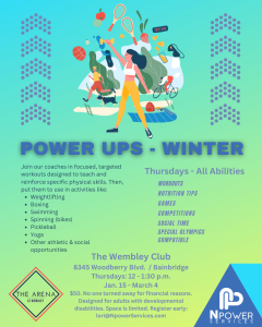 The program is perfect for adults in dayhabs or who do not work during the day and would like to enjoy fitness and social activities in an integrated environment. Power Ups combines fun workouts and physical activities with fun games and conversations about healthy habits, nutrition, and ideas on how to improve our mental, emotional and physical health. Power Ups is held at the Arena at Wembley (8345 Woodberry Blvd. / Bainbridge) from noon – 1:30 p.m. in eight-week sessions.