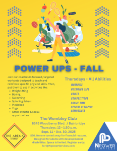 The program is perfect for adults in dayhabs or who do not work during the day and would like to enjoy fitness and social activities in an integrated environment. Power Ups combines fun workouts and physical activities with fun games and conversations about healthy habits, nutrition, and ideas on how to improve our mental, emotional and physical health. Power Ups is held at the Arena at Wembley (8345 Woodberry Blvd. / Bainbridge) from noon – 1:30 p.m. in eight-week sessions.
