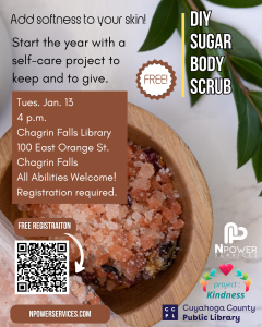 Start off the new year by creating a delightful indulgence for yourself and others. We're making sugar scrubs that you can enjoy in the bath or shower. Help your skin look and feel its best with this natural scrub we will make with sugar, oil and essential oil fragrances. All materials provided. The event is free, but please register so we have enough materials.