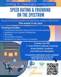 Geauga County, OH – May 19, 2025 – NPower Services, a nonprofit dedicated to supporting adults with developmental disabilities, is proud to announce Speed Dating and Friending on the Spectrum, a unique social experience happening on Tuesday, July 15, 2025, at Acacia Shelter in Lyndhurst, Ohio (across from Cleveland Clinic on Cedar Road).
